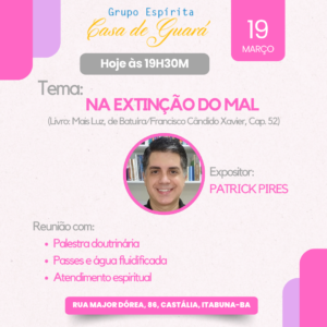 Hoje (19/03) às 19:30Palestra Presencial Estudo: NA EXTINÇÃO DO MAL (Mais Luz, de Batuíra/Francisco Cândido Xavier, Cap. 52).Expositor: PATRICK PIRESLocal: […]