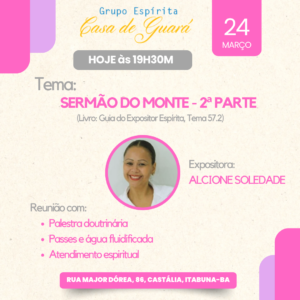 Hoje (24/03) às 19:30Palestra Presencial Estudo: SERMÃO DO MONTE – 2ª PARTE (Guia ao Expositor Espírita, Tema 57.2).Expositora: ALCIONE SOLEDADELocal: […]