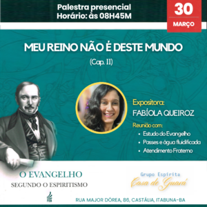 Amanhã (30/03) às 08:45Palestra Presencial Estudo: MEU REINO NÃO É DESTE MUNDO (ESE, Cap. II).Expositora: FABÍOLA QUEIROZLocal: GRUPO ESPÍRITA CASA […]