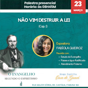 Amanhã (23/03) às 08:45Palestra Presencial Estudo: NÃO VIM DESTRUIR A LEI (ESE, Cap. I).Expositora: FABÍOLA QUEIROZLocal: GRUPO ESPÍRITA CASA DE […]