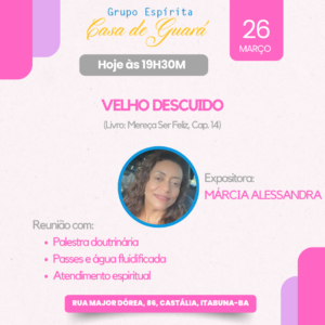 Hoje (26/03) às 19:30Palestra Presencial Estudo: VELHO DESCUIDO (Mereça Ser Feliz, Cap. 14).Expositora: MÁRCIA ALESSANDRALocal: GRUPO ESPÍRITA CASA DE GUARÁ📍https://maps.app.goo.gl/7sDGAp6t8wsFgLwx8 […]