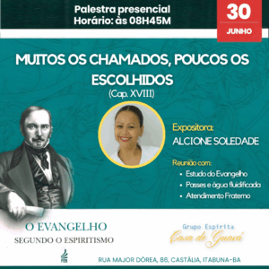 Amanhã (30/06) às 08:45Palestra Presencial Estudo: MUITOS OS CHAMADOS, POUCOS OS ESCOLHIDOS (ESE, Cap. XVIII).Expositora: ALCIONE SOLEDADELocal: GRUPO ESPÍRITA CASA […]