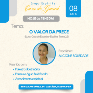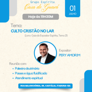 𝗛𝗼𝗷𝗲 (01/07) 𝗮̀𝘀 𝟭𝟵:𝟯𝟬𝗣𝗮𝗹𝗲𝘀𝘁𝗿𝗮 𝗣𝗿𝗲𝘀𝗲𝗻𝗰𝗶𝗮𝗹 Tema: CULTO CRISTÃO NO LAR (Guia do Expositor Espírita, Tema 21)Expositor: PERY AMORIMLocal: GRUPO ESPÍRITA […]