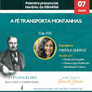 Amanhã (07/07) às 08:45Palestra Presencial Estudo: A FÉ TRANSPORTA MONTANHAS (ESE, Cap. XIX).Expositora: FABÍOLA QUEIROZLocal: GRUPO ESPÍRITA CASA DE GUARÁ📍https://maps.app.goo.gl/7sDGAp6t8wsFgLwx8 […]