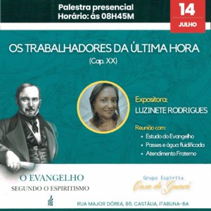 Amanhã (14/07) às 08:45Palestra Presencial Estudo: OS TRABALHADORES DA ÚLTIMA HORA (ESE, Cap. XX).Expositora: LUZINETE RODRIGUESLocal: GRUPO ESPÍRITA CASA DE […]