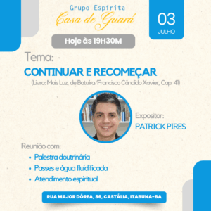 Hoje (03/07) às 19:30Palestra Presencial Tema: CONTINUAR E RECOMEÇAR (Mais Luz, de Batuíra/Francisco Cândido Xavier, Cap. 41)Expositor: PATRICK PIRESLocal: GRUPO […]